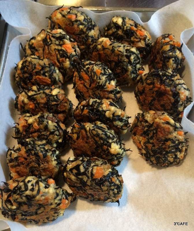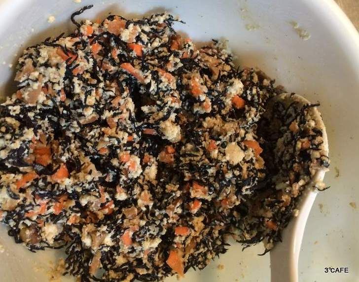 - 水切りした豆腐と○の材料をボールに入れ、しゃもじですりつぶし、切っておいたにんじん、しいたけと水洗いしたひじきを混ぜる