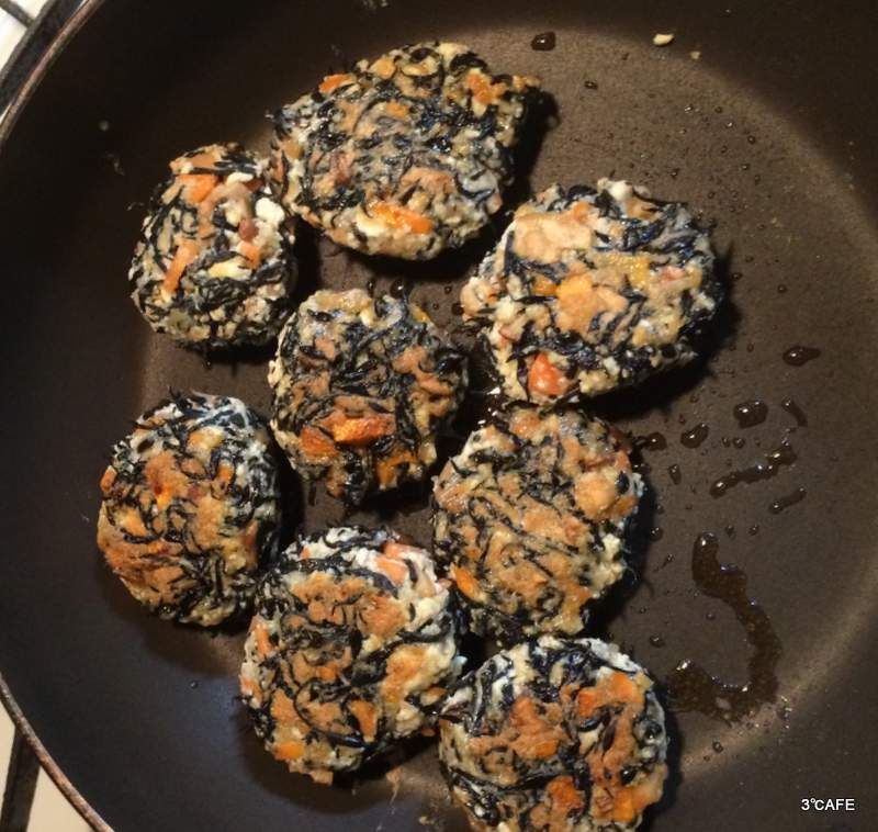 - 一口サイズに丸めたら、サラダ油(大さじ2)をフライパンで加熱しがんもどきを転がすようにして揚げ焼きにする