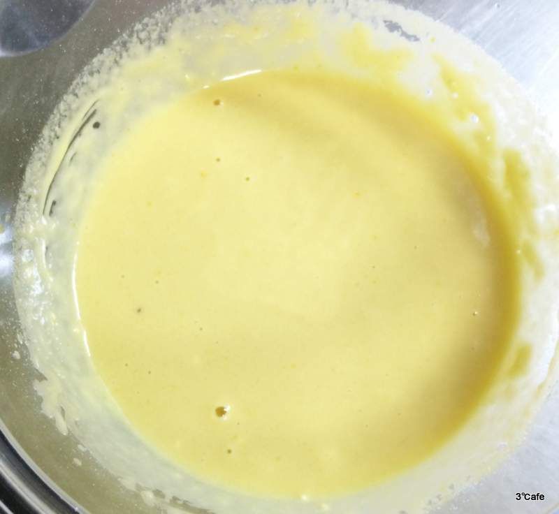 - ♠の材料をボールに入れてかき混ぜ、卵、オレンジジュース、オリーブオイルを加え混ぜ合わせる。