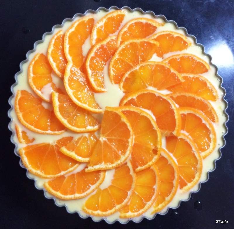 - 表面にスライスしたみかんを並べ、水で薄めた卵黄(♦)を塗る。