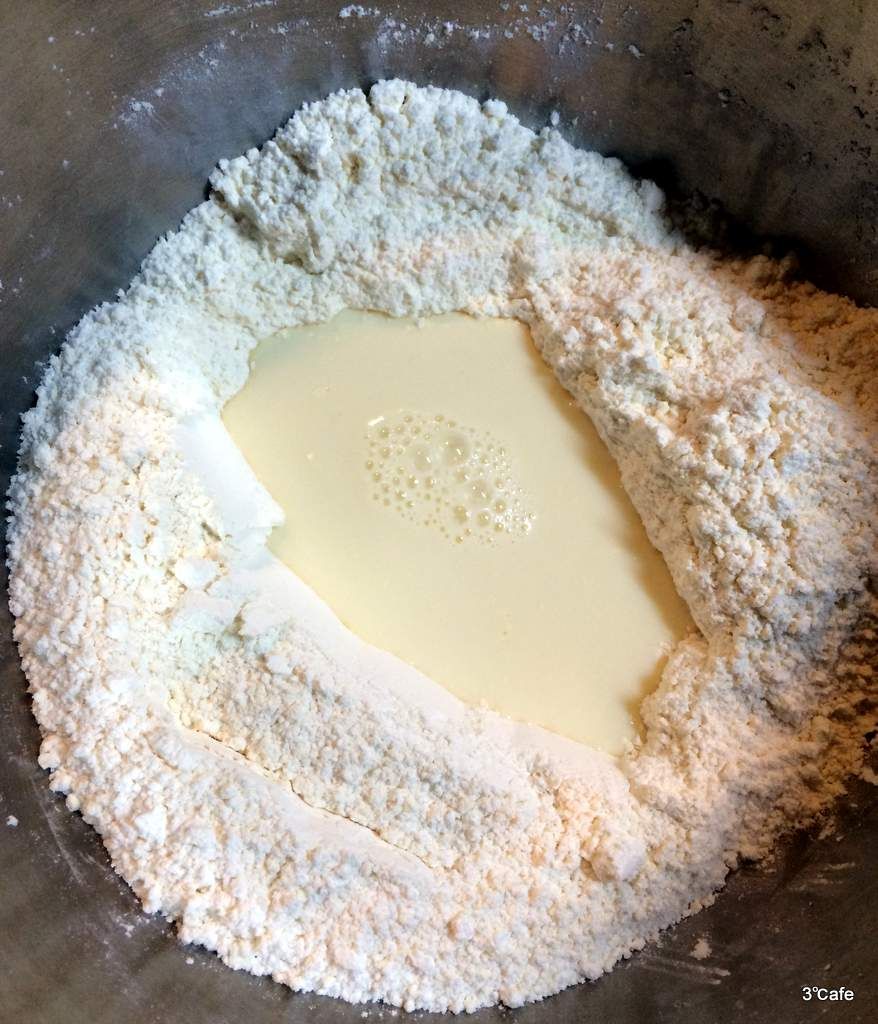 - 真ん中をくぼませて、中央に牛乳もしくは豆乳を加える。