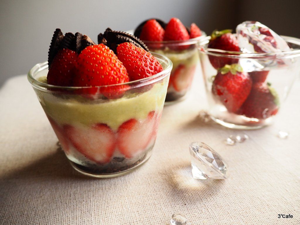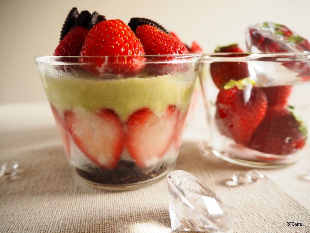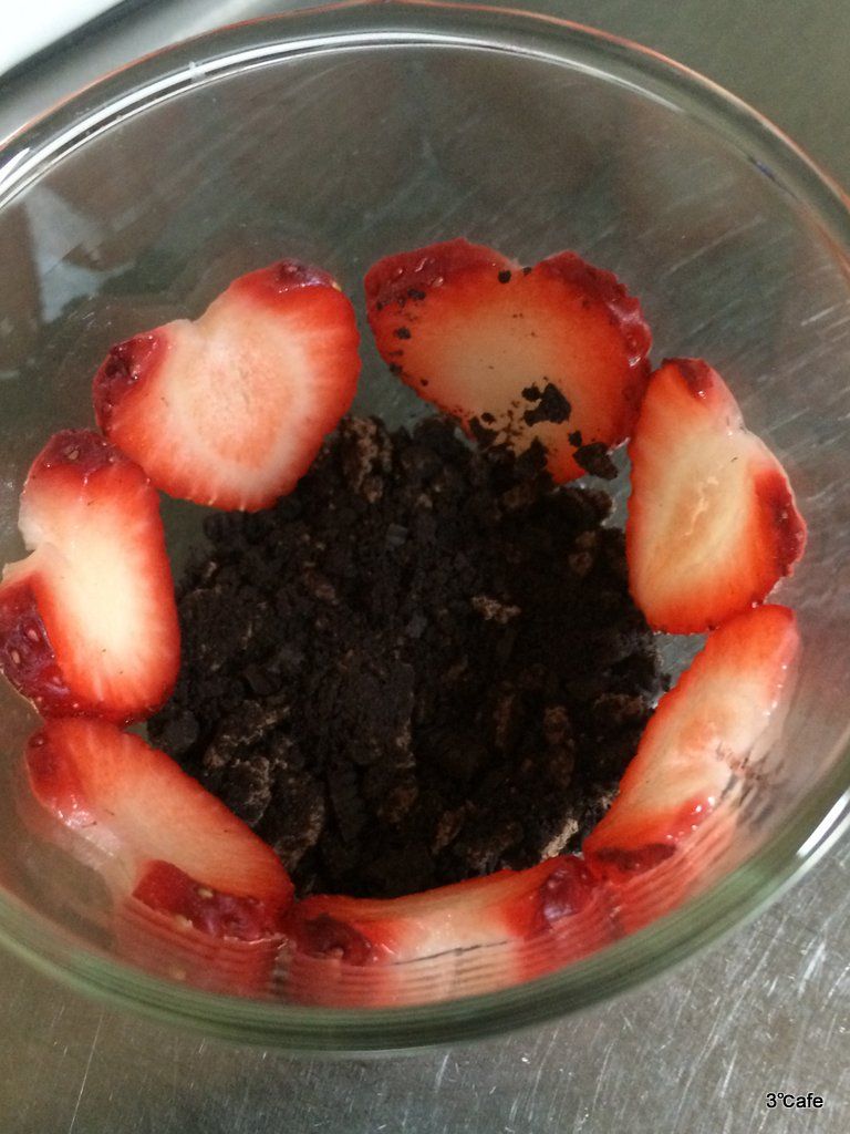 - グラスの底に細かく砕いたオレオを敷き、側面に薄くスライスしたイチゴを貼る。