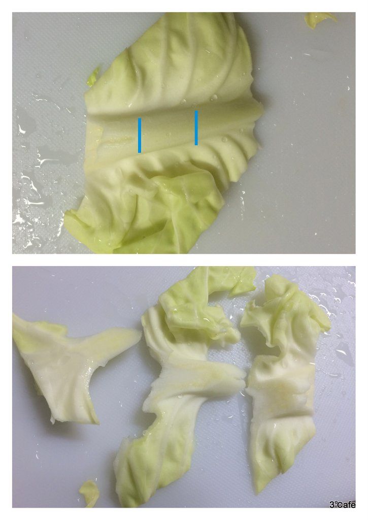 - キャベツは葉の柔らかい部分は大きめに、芯の硬い部分は写真水色のラインで斜めにそぎ切りにする。