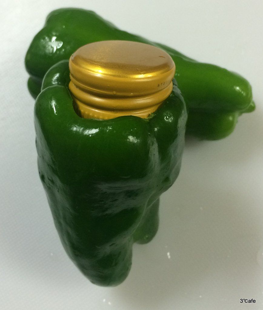- ピーマンは、お酒のビンの蓋を使って種を取り除く。