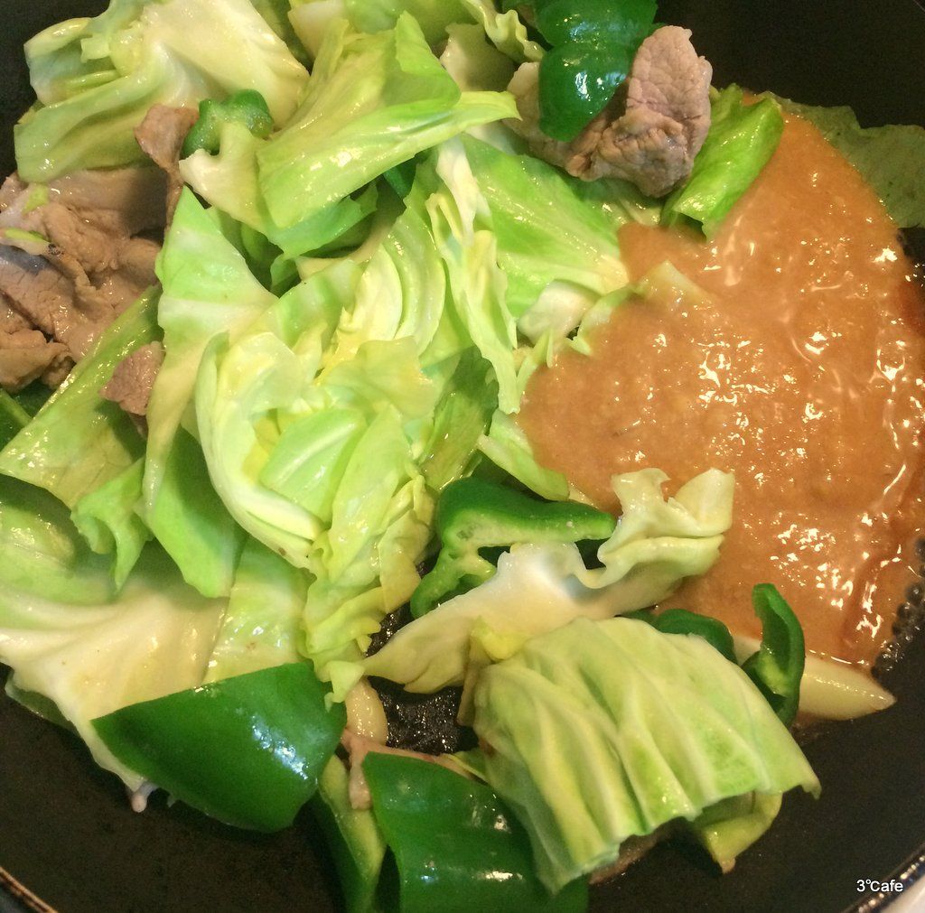 - 豚肉の色が変わったら、ピーマンとキャベツを加える。