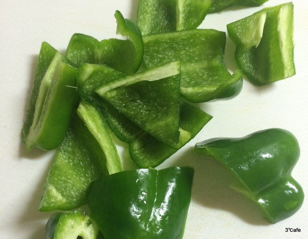 - ピーマンは縦に半分に切って、さらに斜めに切ると、断面が広くなるので早く火が通る。