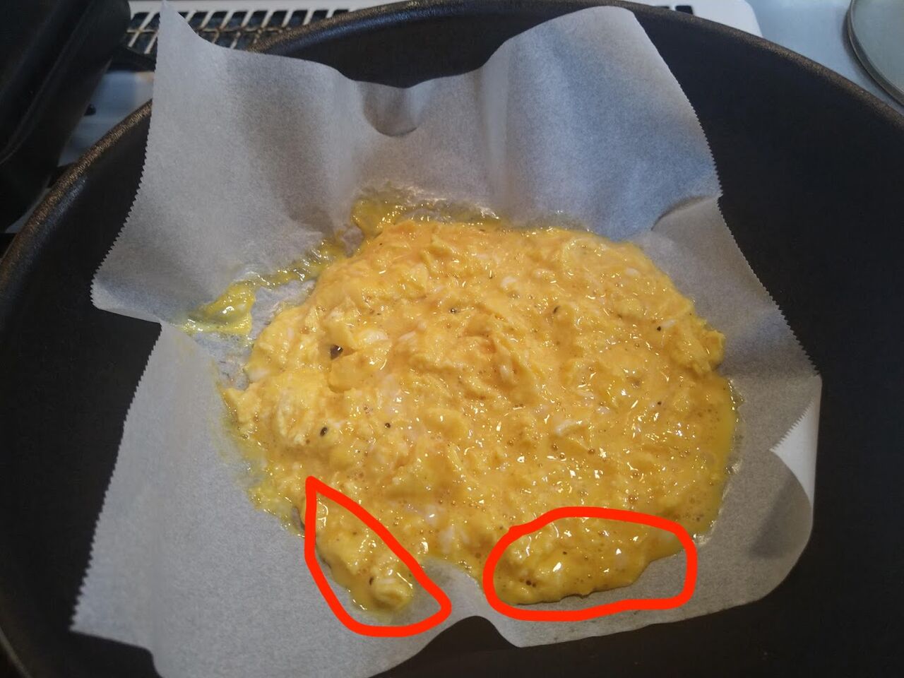 4.火が通り切っていない箇所(赤で囲ったところ)がこれくらい残っているタイミングで、クッキングペーパーごとフライパンから外します。