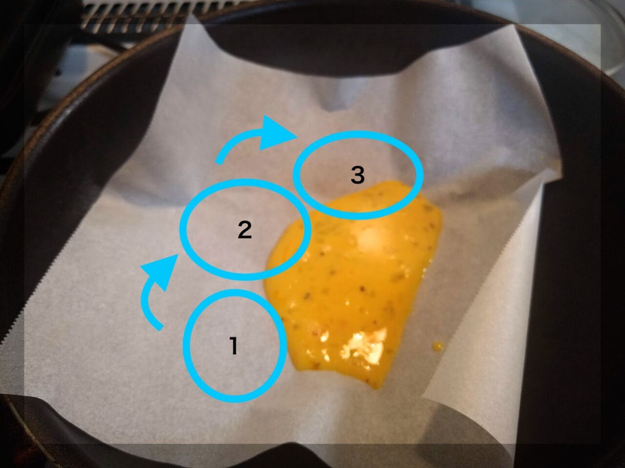 3.卵液を一箇所に流し込むと、温度が一気に下がってしまいます。写真に写っている程度の量を、1→2→3の順に、位置をずらして流していってください。