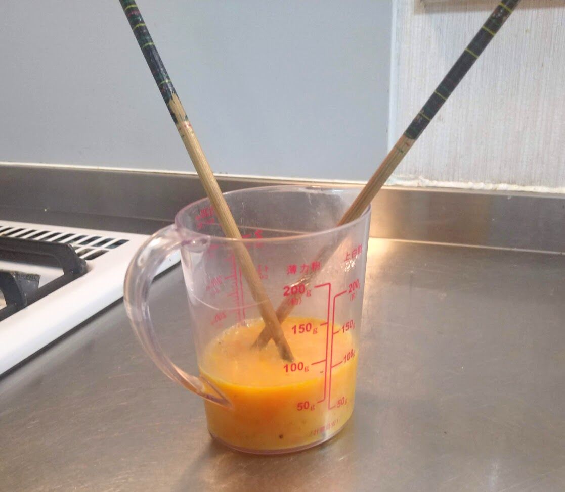 1.卵3個を溶きます。白身が固まっていると、見栄えが悪くなります。